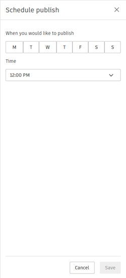Note: Currently, only weekly publishing is supported.Use the Time drop-down list to select the hour of day in which the publish should occur.