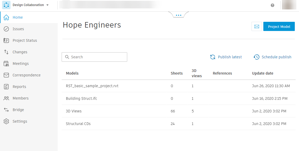 The Home tool contains the Team Space, which is the main portal for your team in Design Collaboration. It provides an up-to-date viewing experience of the current state of your models. When you first enter the Home tool, you see a list of the latest models, sheets, and 3D views that your team has published as sets from Revit.