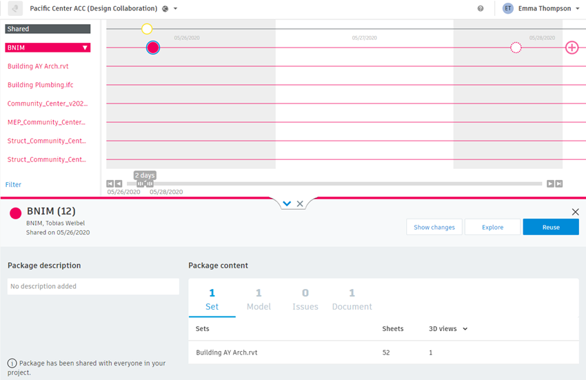 The newly shared items from the package are shown in the viewer in the context of the aggregated project model. Use the options in the panel to filter by teams, phases, and levels, or to see a list of sets, models, and documents in the package. See Aggregated Project Model for more information.