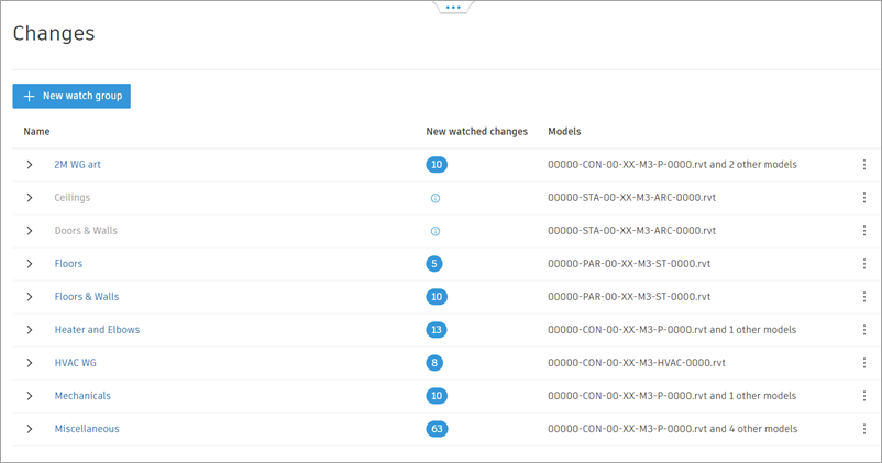 The number icon indicates the number of new changes for the watch group. Expand a watch group to view the models and items included, and to see the number of changes for those models and items.