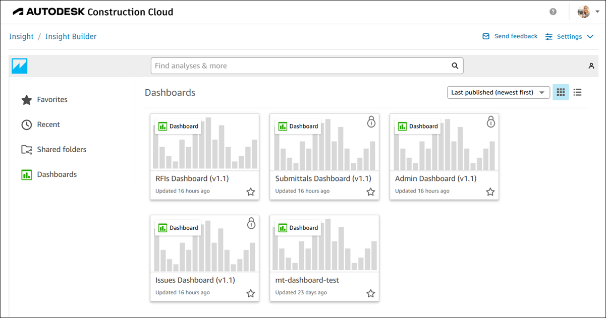 A dashboard is a collection of charts, graphs, and insights published and made available to members with the Reader permission level. This includes dashboards and paginated reports. See Insight Builder Terminology for a list of terms specific to Insight Builder.
