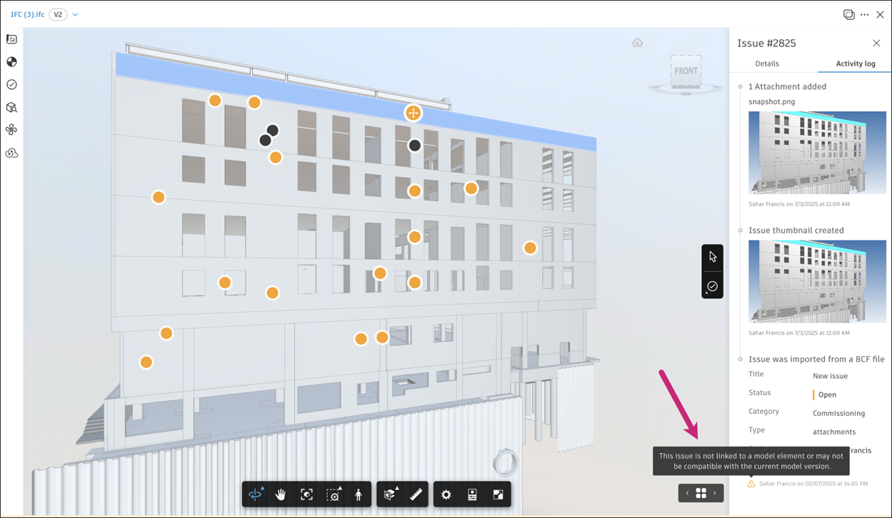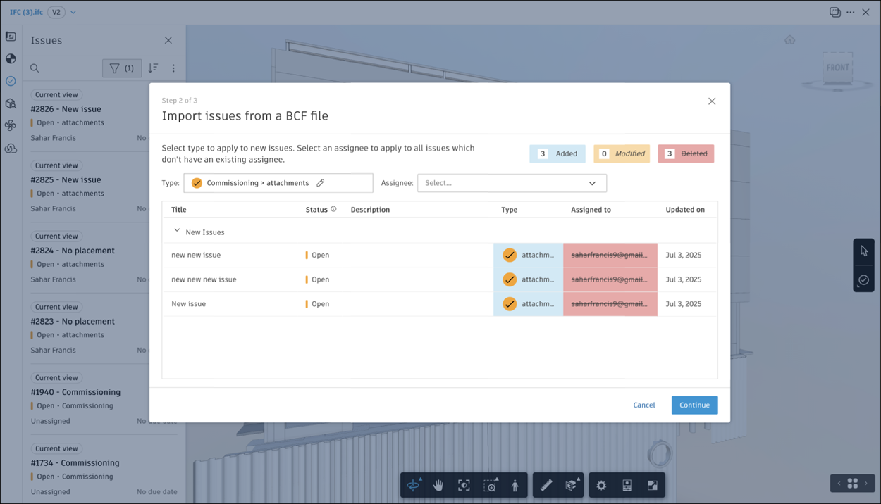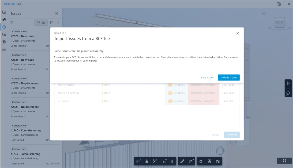 When you import BCF issues into the Issues tool, some issues may not include a selected element. ACC requires each issue to be placed on a specific element in the model. If such issues are imported, you will be prompted to either import or skip them, as described below.