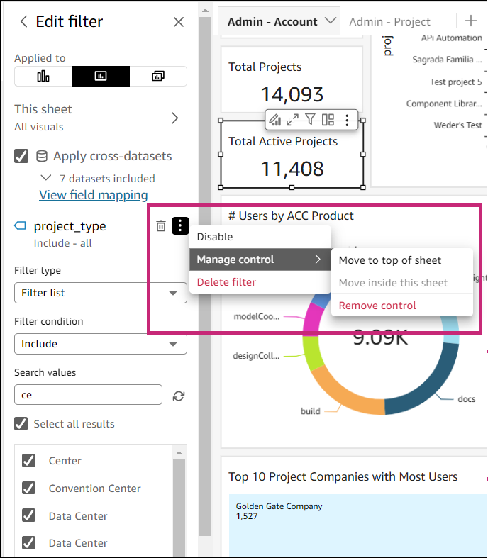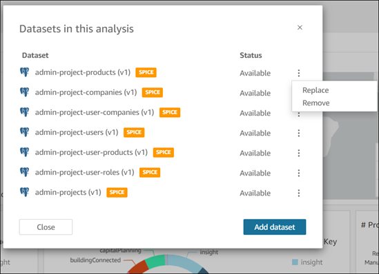 Click Manage datasets to view, replace, and remove datasets in the analysis.