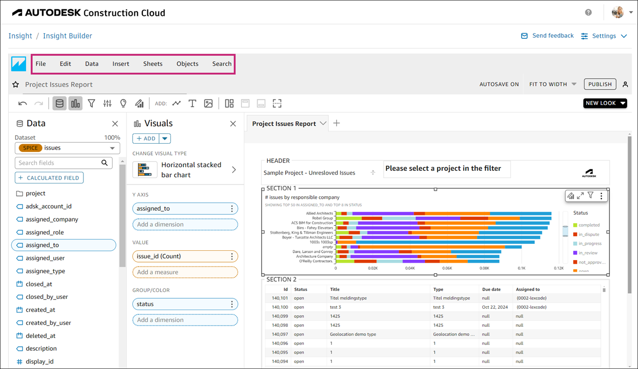 - Insert: Use to add sheets, visuals, text boxes, insights, calculated fields, filters, and parameters to the analysis.