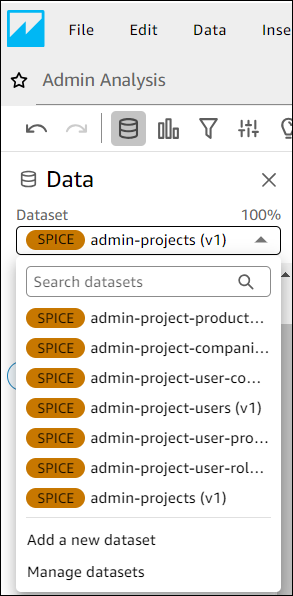 Use the Datasets icon in the toolbar at the top left of the page to change, add, and configure data sets.