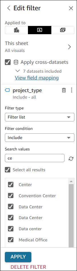 Click the filter of your choosing to select a desired type and filter condition, and select relevant values. When done, click Apply.