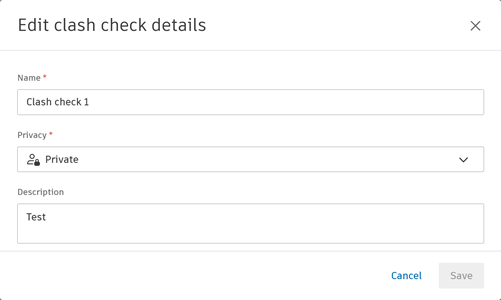 .Edit the name, privacy, or description in the Edit clash check details dialog.
