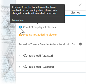 Clashes can be present against the placement model (the model on which the issue pushpin was placed), and also between other, secondary models. This means there can be different combinations of clashes that have been resolved, and clashes that are still visible in the issue. Review the tooltips in the issue panel > Clashes tab, which provide more information based on the specific scenario: