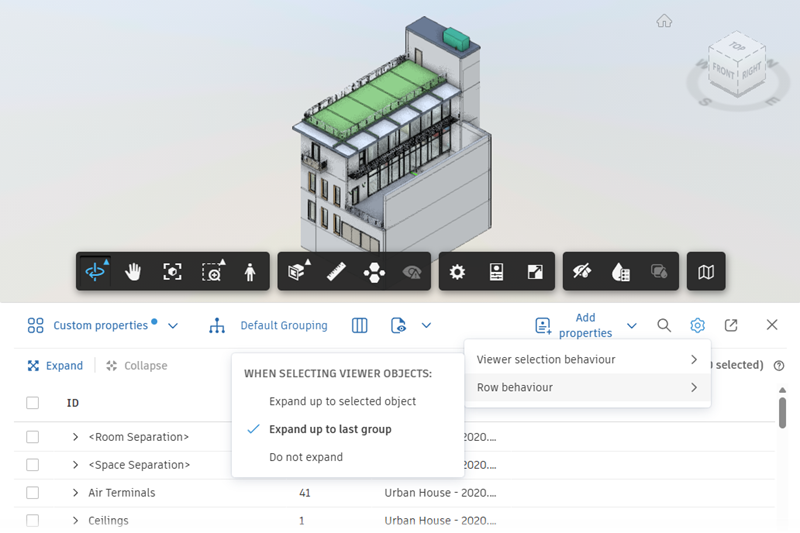 - Expand up to last group - the object table expands the rows to the level of the group that the selected object is in.