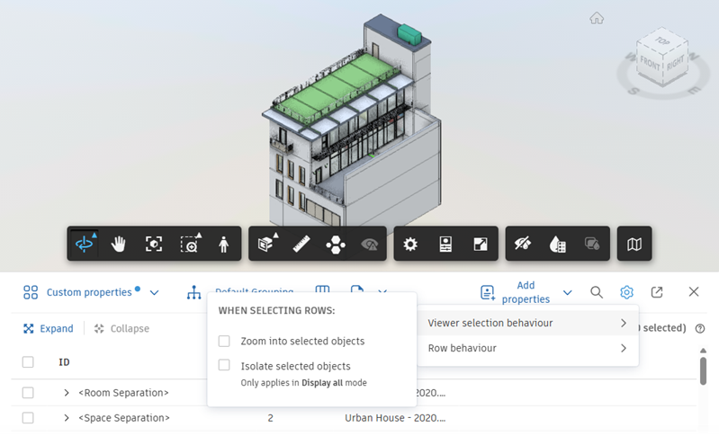 Select the Isolate selected objects checkbox to isolate objects in the viewer when you select them in the object table.