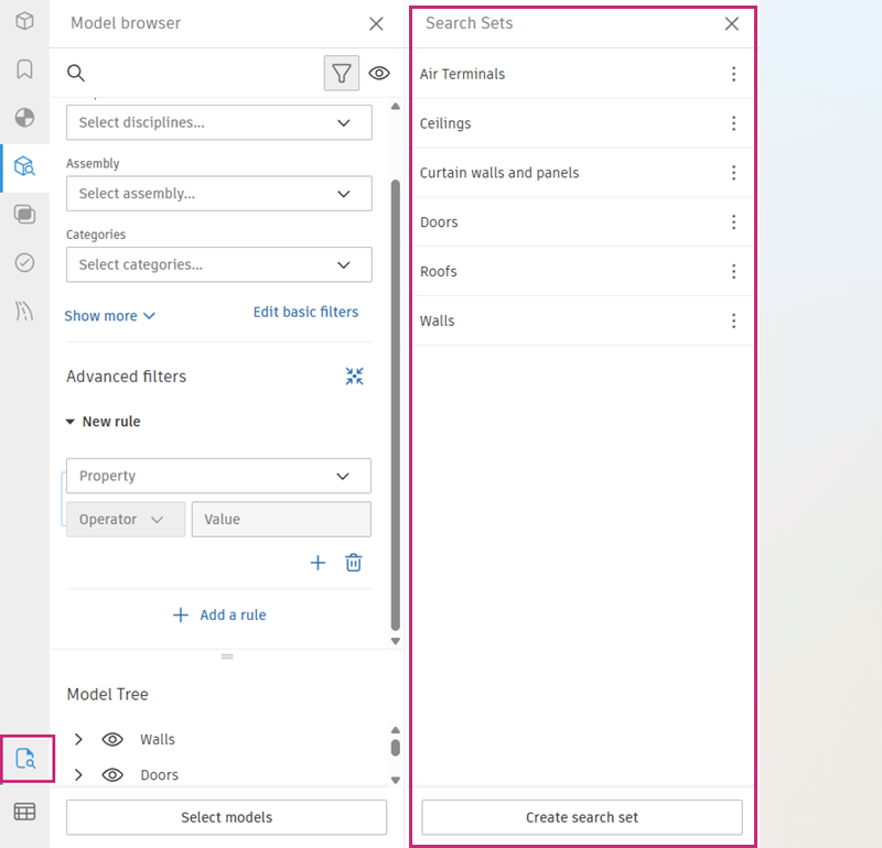Search sets are saved queries that scan model data and return objects matching your criteria. You can define the queries using basic or advanced filters in the viewer. These include model properties such as category, type, system, length and so on, dependent on the object-level data in your models and views.