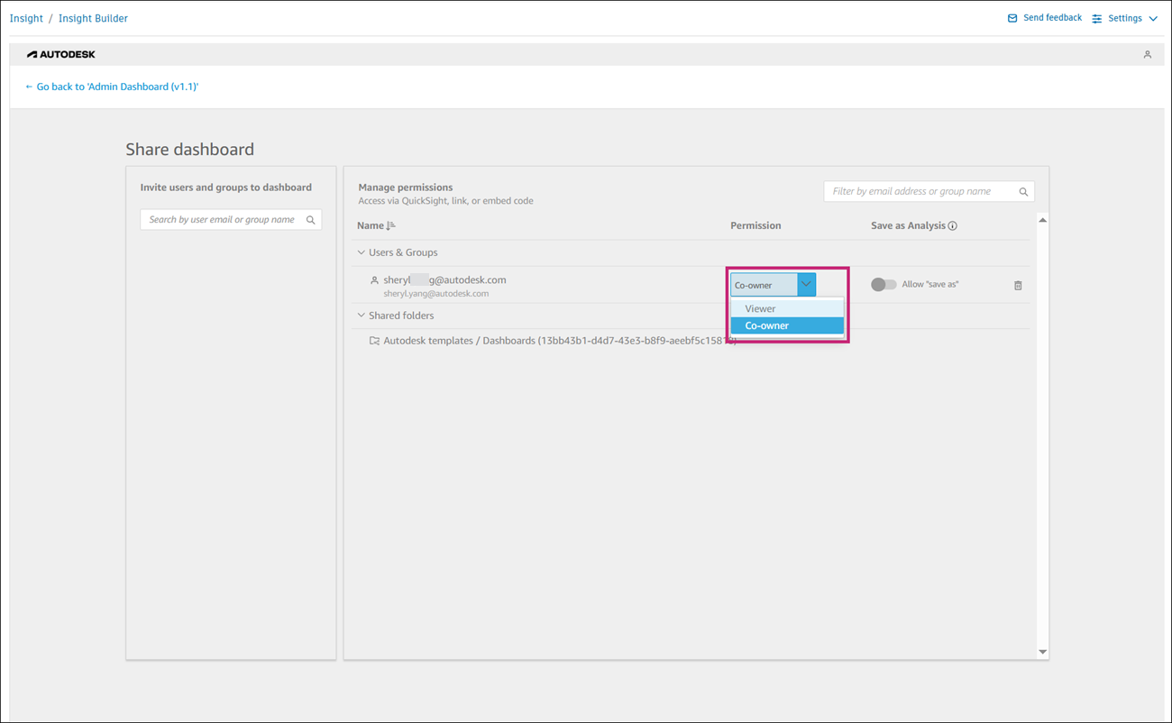 Tip: Use the Search field to quickly find a user or group by email address or group name.Select the desired permission level: Viewer or Co-owner.