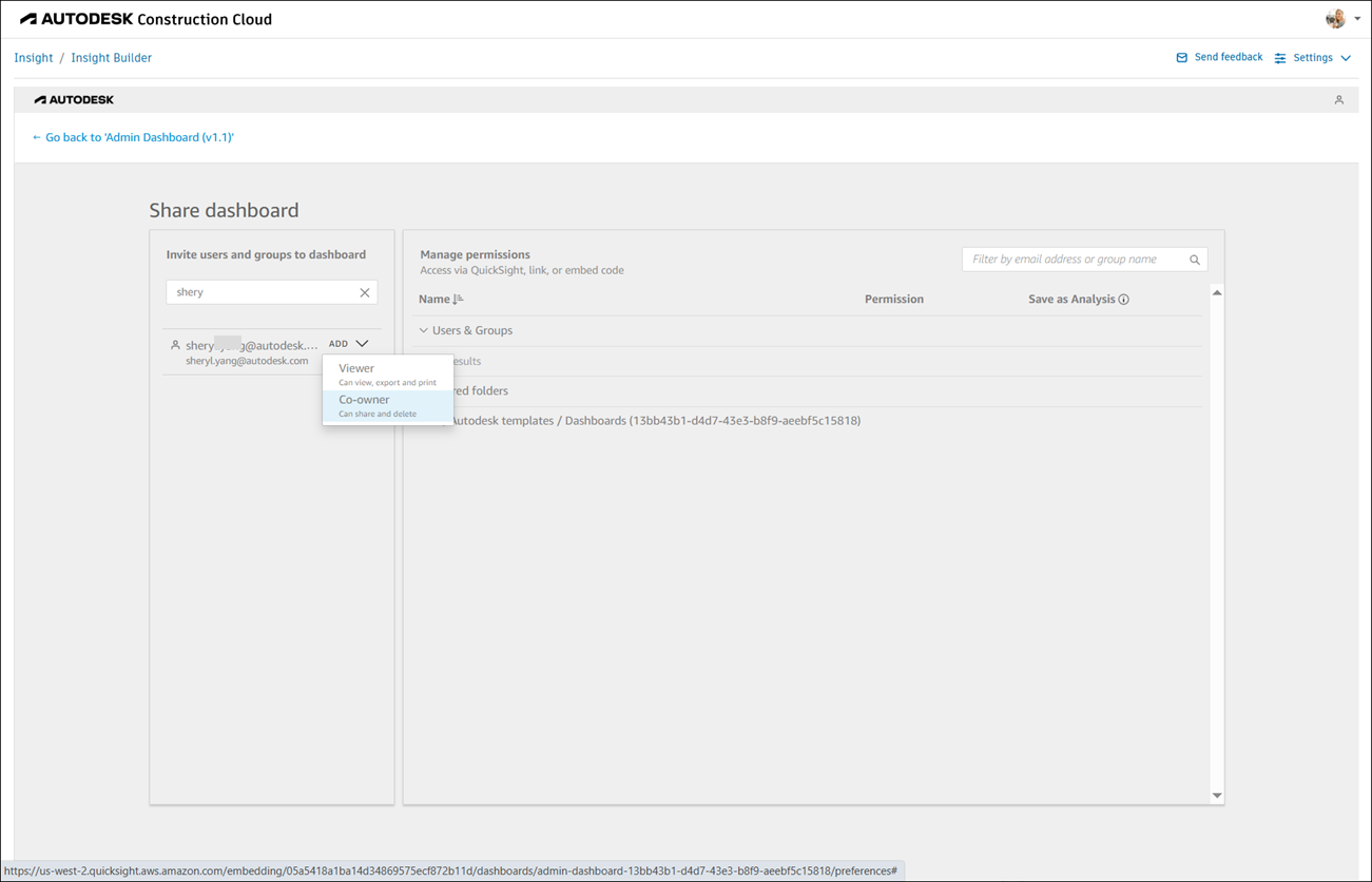 Note: Viewers can view, export, and print dashboards, while Co-owners can share and delete dashboards.