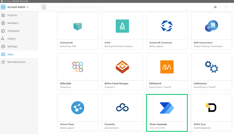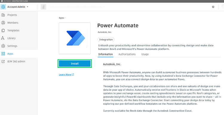 An account administrator needs to install the Power Automate app from the App gallery to your Autodesk Construction Cloud account. This enables the Autodesk Data Exchange connector in Power Automate to work with your Data Exchanges.