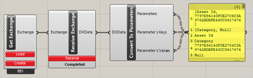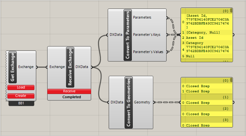 Connect the output of the ReceiveExchange node to the input of the ConvertToParameters and ConvertToGeometries nodes.