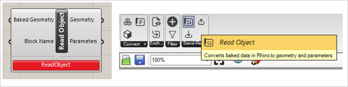 This node is useful to get the baked Geometries list and their Attributes. "Baking" refers to the process of converting dynamic or procedural objects into static, editable objects. This process involves evaluating the geometry of a dynamic object and converting it into a set of meshes or surfaces that can be manipulated and used for further editing or exporting to other applications. Baking can be used to improve the performance and stability of a model by reducing the amount of processing required for each interaction with the model, and by allowing users to work with a more straightforward and editable representation of their design. This node takes single or multiple Baked Geometries or Rhino Object Block as input and provides Geometry lists and their Parameters as output.