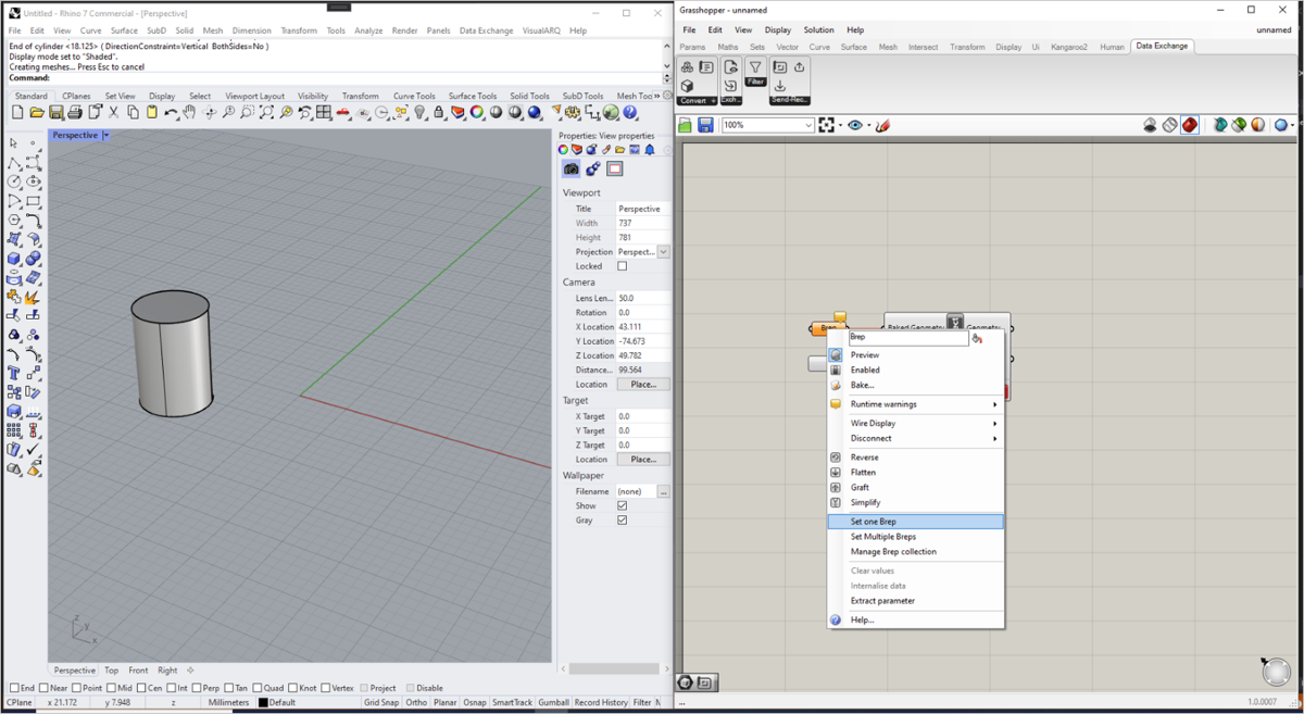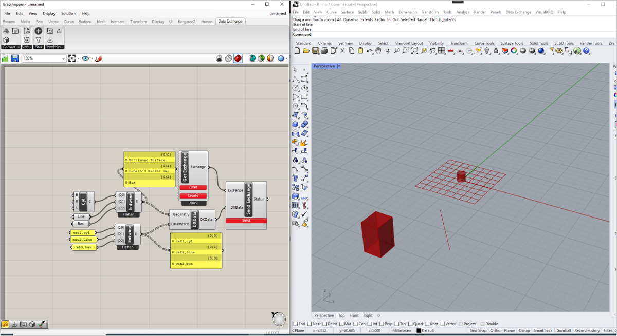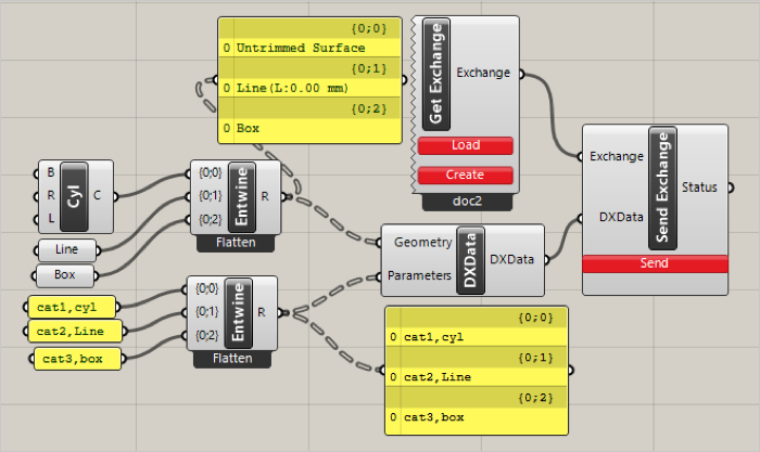 You must use the SendExchange node to take native GH geometry as input. Connect the output of the native GH geometry node to the input Geometry of the DXData node and the output of the DXData node to the input SendExchange Node. Here the sequence of connection of Geometries and Parameters should be the same.