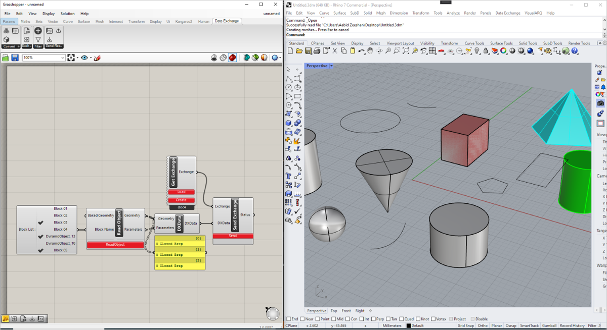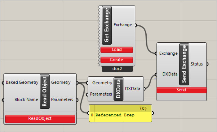 You must use ReadObject Node if you are taking baked geometry from Rhino and connect the output Geometry of the ReadObject node to the input Geometry of the DXData Node and the output of the DXData node to the input DXData of the SendExchange node.