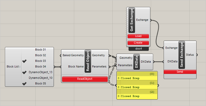 You must select the required blocks using checks from the value list of the blocks node attached to the ReadObject node. After that, connect the output Geometry of the ReadObject node to the input Geometry of the DXData node and the output of the DXData Node to the input of the SendExchange Node.