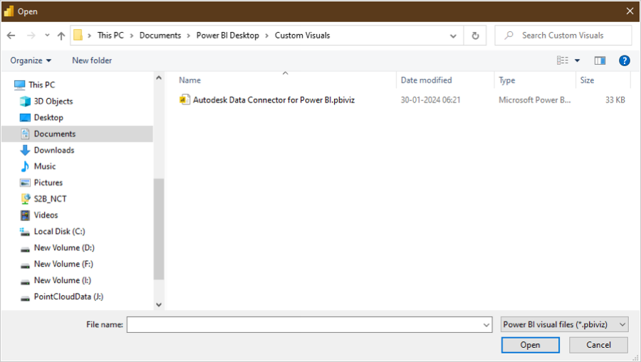 Select C:\Users<UserName>\Documents\Power BI Desktop\Custom Visuals\Autodesk Data Connector for PowerBI.pbiviz and click Open.