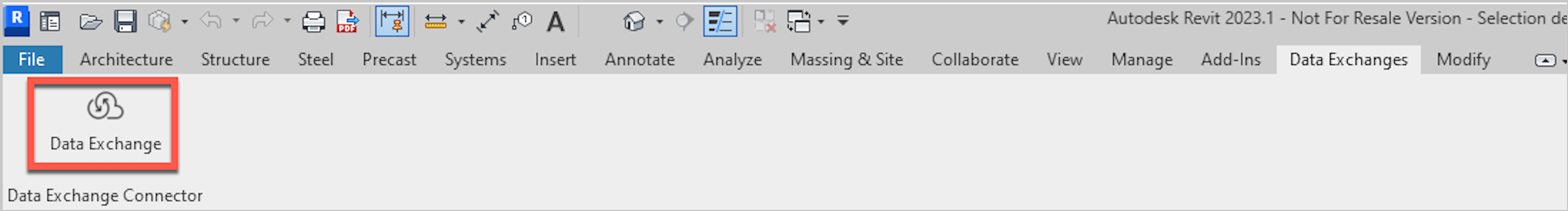 For Autodesk Data Exchange Connector for Revit 2023, the Data Exchange command is available under Data Exchanges tab.