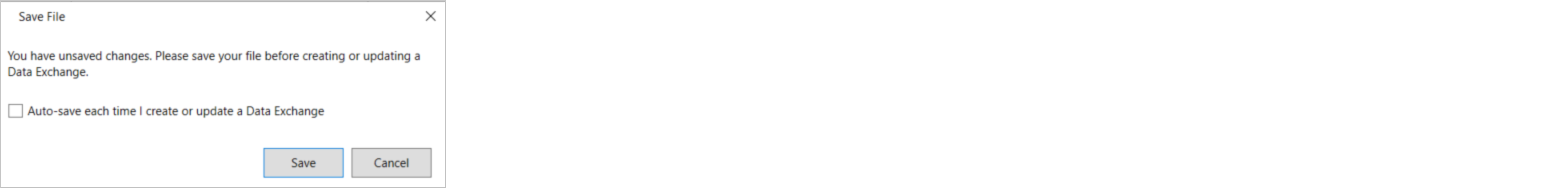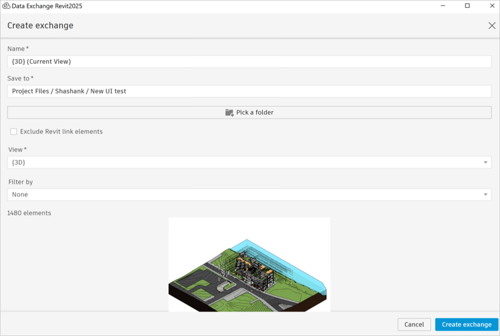 Note: For models exceeding 10,000 elements, a warning signals that exchange creation may take a few minutes. Maintain Revit active and consider smaller data subsets for expedited creation.If there are unsaved changes to your Revit model, save the changes in Revit before you proceed to create the exchange. Otherwise, you will be prompted to save your changes before the exchange is created. You can enable the Auto-save function to automatically save your changes.