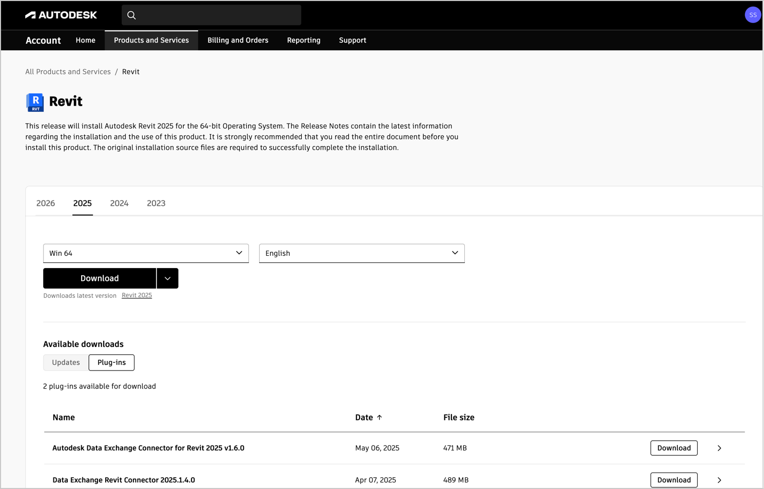 - In the Products and Services section, find Revit and select the required version tab.