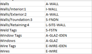 A layer named A-WALL will be mapped to the Walls category. The layer names used in mapping are compliant with AIA (American Institute of Architect Standard). The CSV file entries are listed in alphabetical order. If necessary, you can add the required category for mapping in this table.