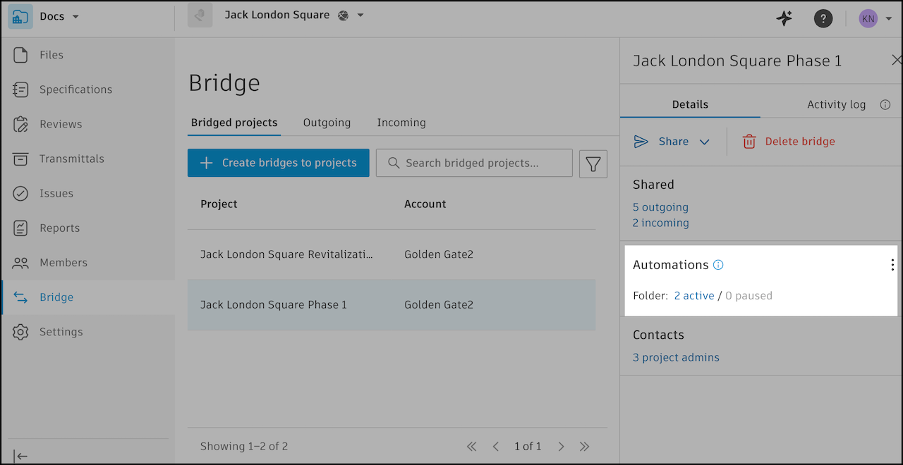 Automations in Bridge are automatic updates set up for shared sheets or folders in the project.