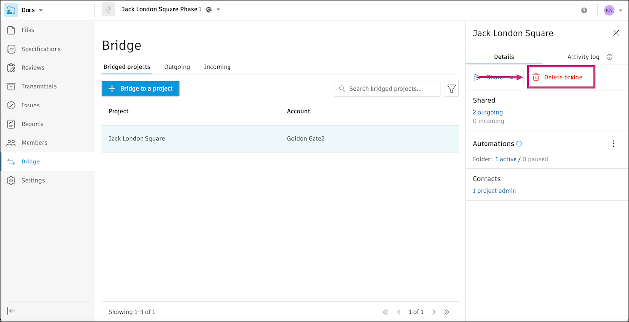 In the Bridged projects tab, click the project where you want to delete the bridge.