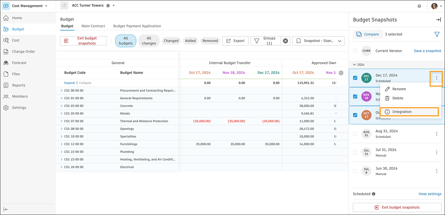 Budget Snapshots Integration State – Within the Budget Snapshots flyout, members can now see if a Snapshot has been integrated with their ERP by clicking the three-dot More menu, then selecting Integration.