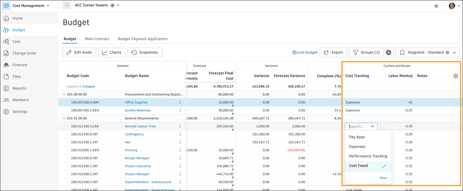 Enter Custom Attributes Directly in Budget/Contract Overview Columns – To help increase efficiency, members can now directly enter custom attribute information (except for text-type attributes) within the columns of the budget/contract overview table. This can be done without needing to switch to edit mode.