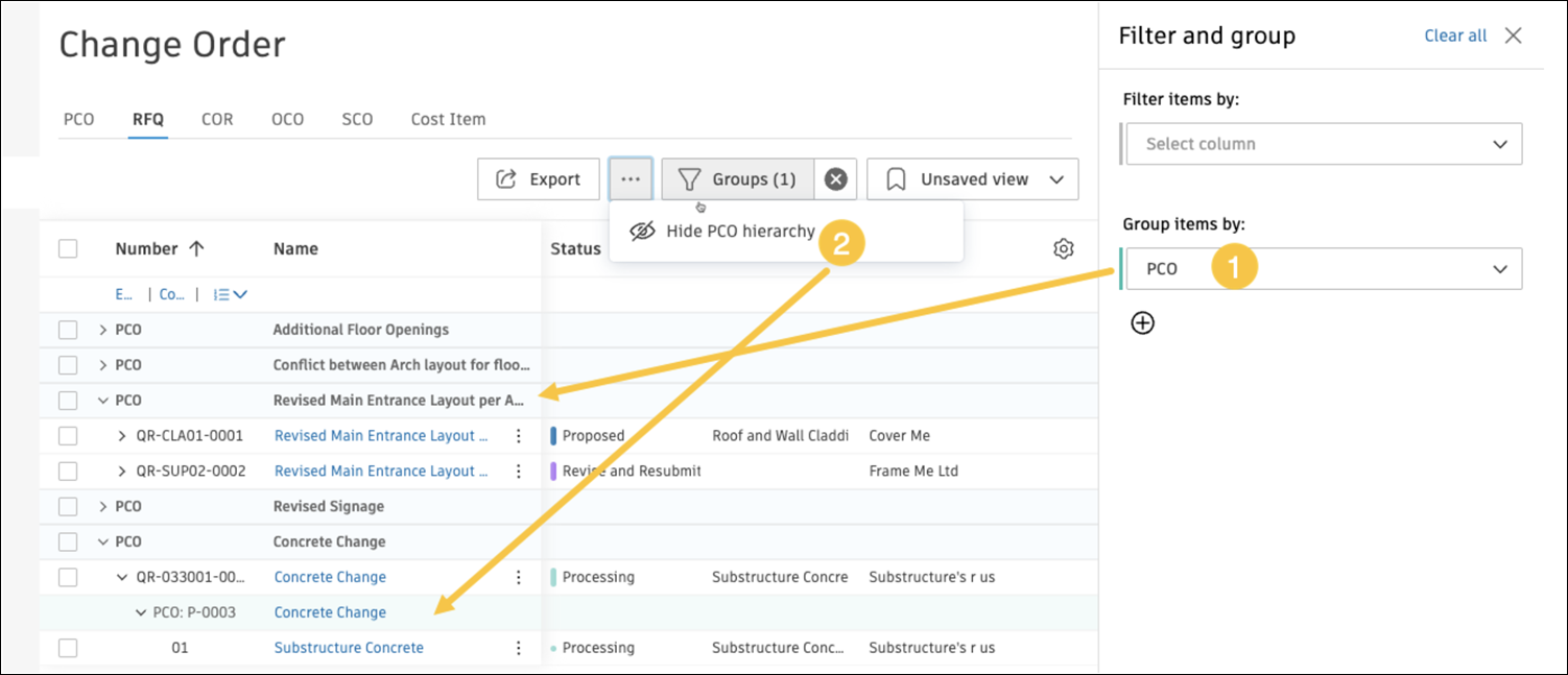 RFQ and SCO Group/hierarchy by PCO – Added the ability for members to group by PCO option (1) or show PCO in hierarchy option (2), or both.