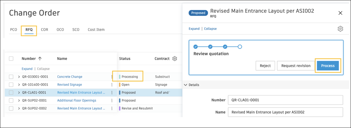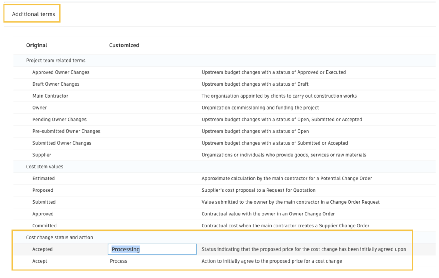 Customize Accept & Accepted terms in RFQ workflow – Within the General tab in the Settings tool of Cost Management, project administrator can now modify the two status and action terms used in RFQ workflows.