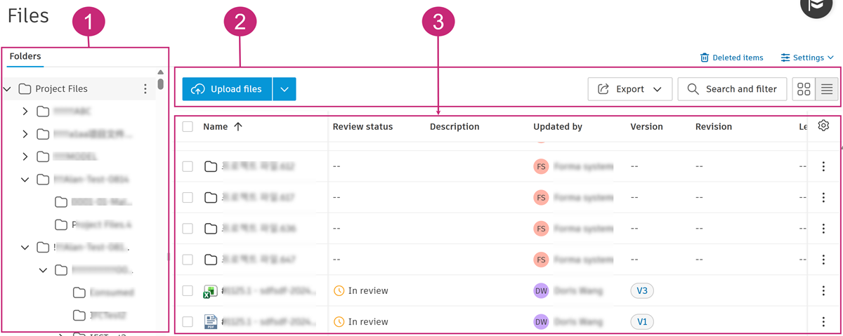 | 3 | Files list | Single item - Either right-click, or click the More menu of a file or folder in the files list to view actions for the relevant file or folder. Multiple items - If you select multiple files, or files and folders, you can right-click one of those to view actions relevant to those selections. |