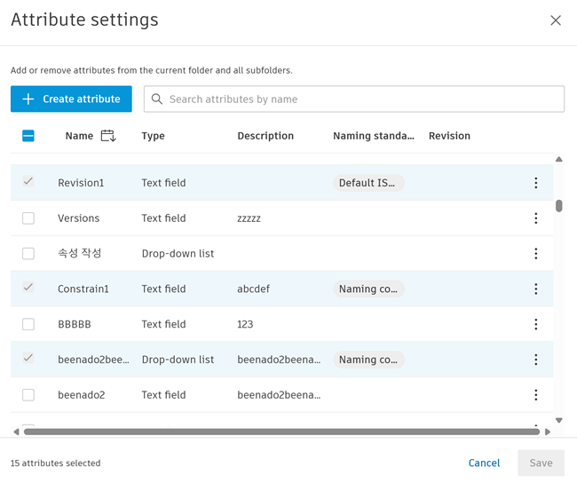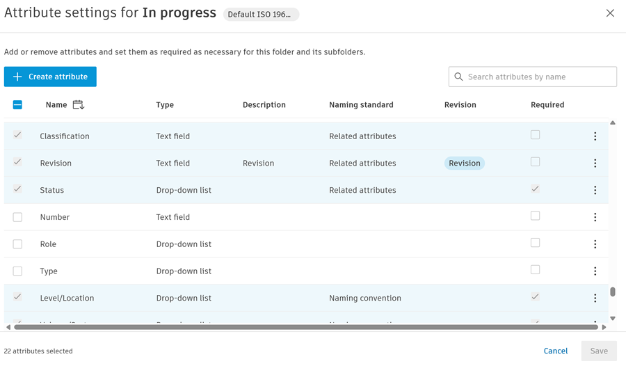If any attributes are already added to the folder, those attributes will be already selected. If naming standard attributes are already added to the folder, they will be selected and the checkbox disabled as naming standard attributes can't be removed once added to folders.