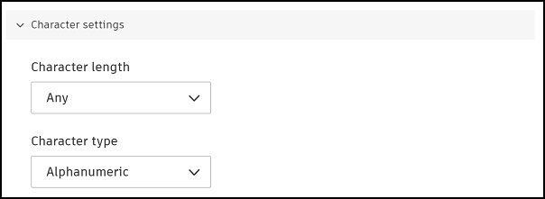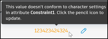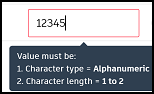 If a text field attribute has character setting constraints applied and your value doesn't comply with those restraints, guidance will display detailing the correct character length and type required.