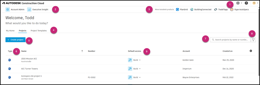 The project list shows all projects that you have access to. This includes both Autodesk Construction Cloud and BIM 360 projects.