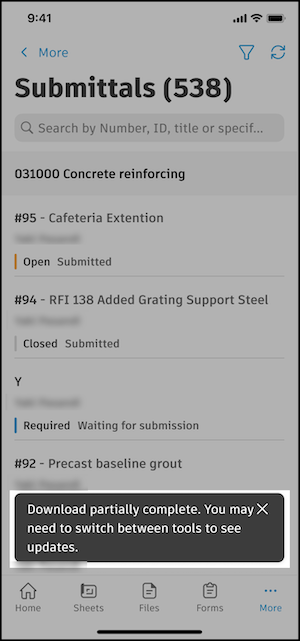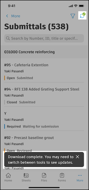 In-project sync is available on all the tool list views in the Autodesk Construction Cloud mobile app. This is the view that lists the items in that tool, for example submittals as shown in the following screenshot.