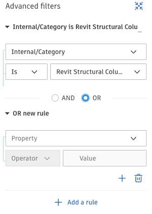 Note: This property comes from the categories in Revit. For an IFC or other file format, see the table above for useful properties to filter by.Keep the operator as Is and choose the value Revit Structural columns.