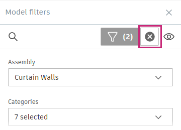 To remove all advanced filters and the value from basic filters, click the X icon at the top of the Model browser panel, or use the reset option in the viewer.