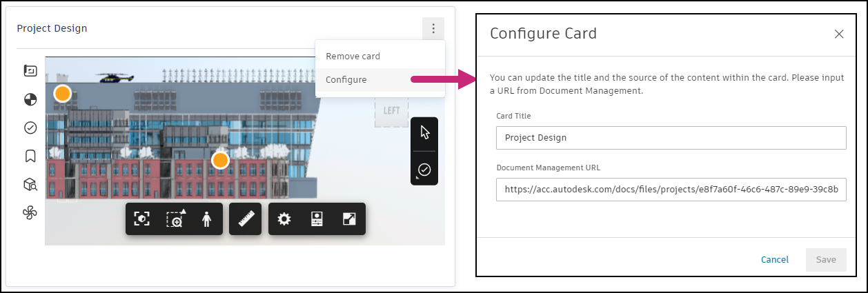 Note: If the URL you received from the partner company doesn't work, contact our support team at bim360partnercard@autodesk.com.If you have added any Design cards, such as the Project Design card, to embed a project model or drawing, click Configure and enter the URL for each one. Optionally, edit the title of the cards.