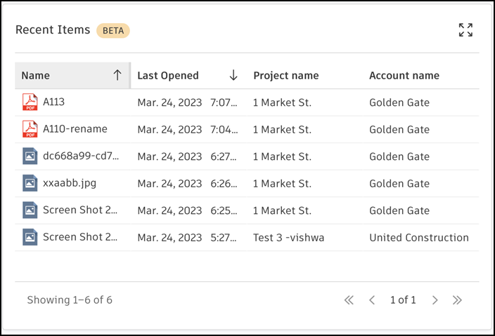 The Recent Items card gives an overview of the files and sheets viewed in the last seven days.