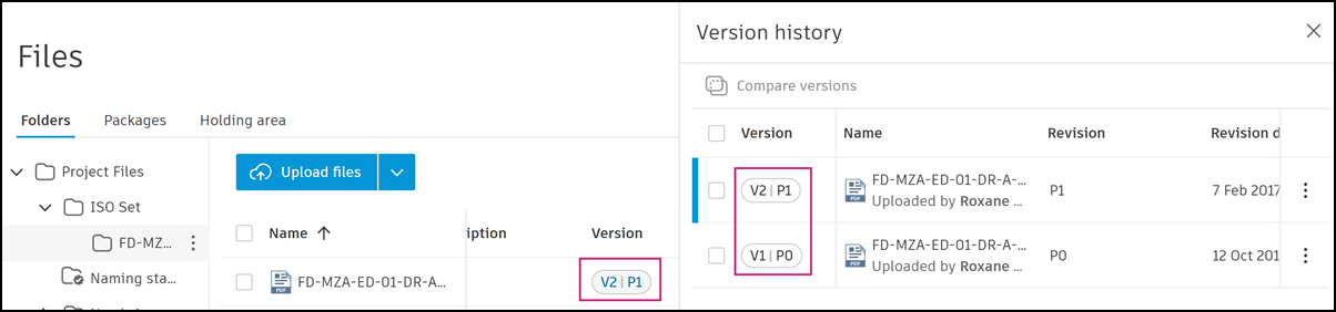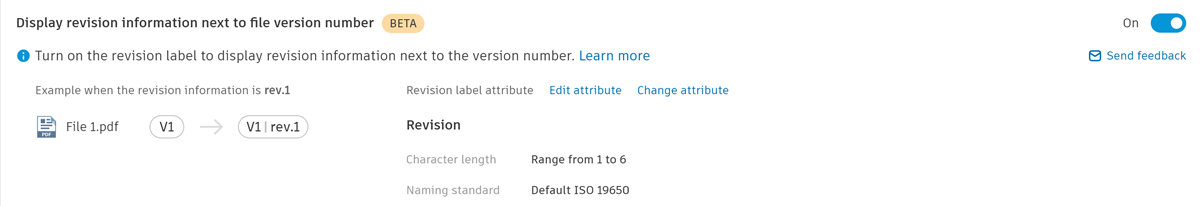 The revision label workflow allows you to display revision information next to the file version number. Project administrators need to access Settings > Advanced settings in the Files tool to turn on the revision label.