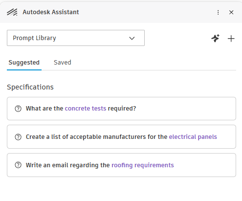 To use Autodesk Assistant in ACC, you can write any question you have about your specification data or select a question to ask from a list of sample prompts.