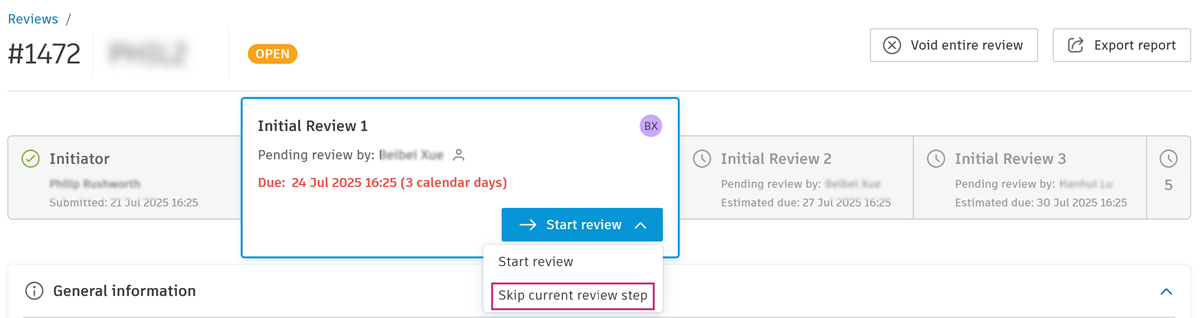 Project administrators can skip review steps to move reviews forward to the next step. This can be useful, for example, when reviewers are unavailable and project administrators can simply skip the step intead of having to claim and submit tasks on behalf of reviewers. Skipping a step can also reduce manual workarounds when reviews are stuck.