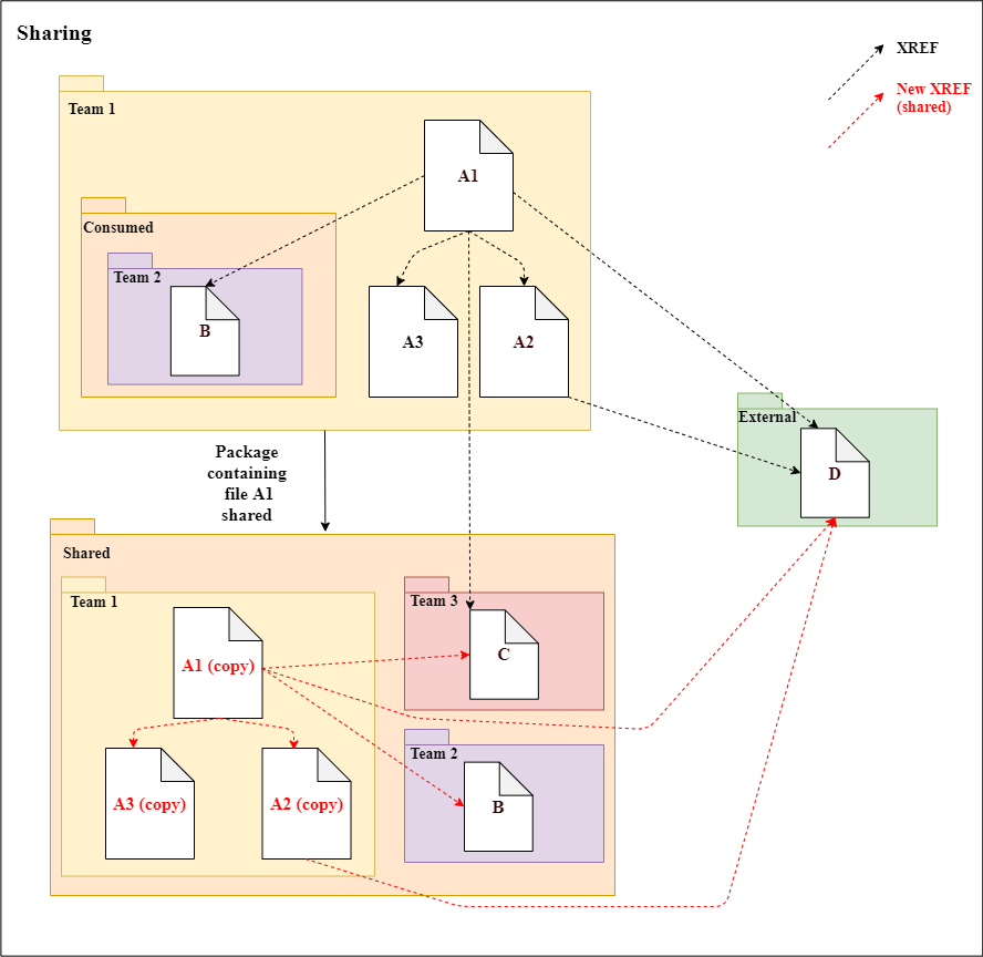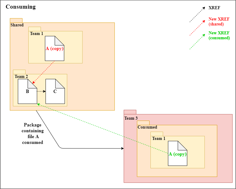 Consuming: When Team 3 consumes the package, both files A and B are copied to the Team 3 > Consumed > Team 1 folder, and an XREF is created between the copies. This is because file B was previously shared by Team 1.