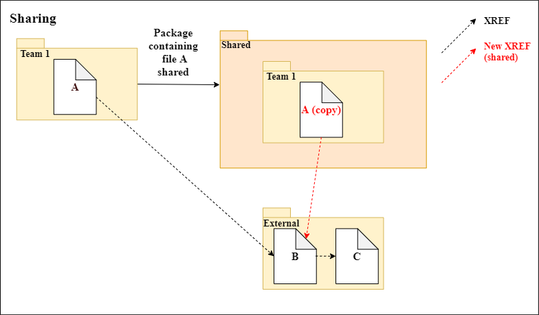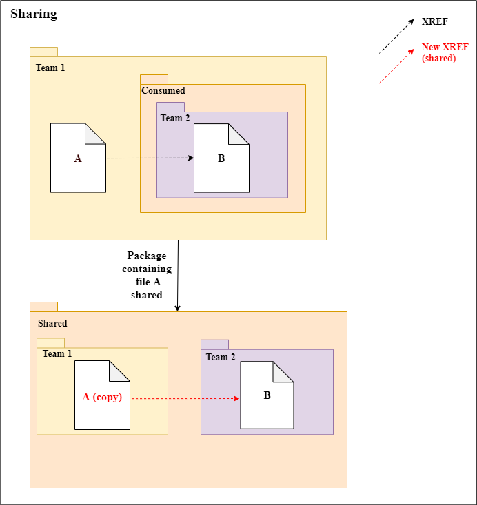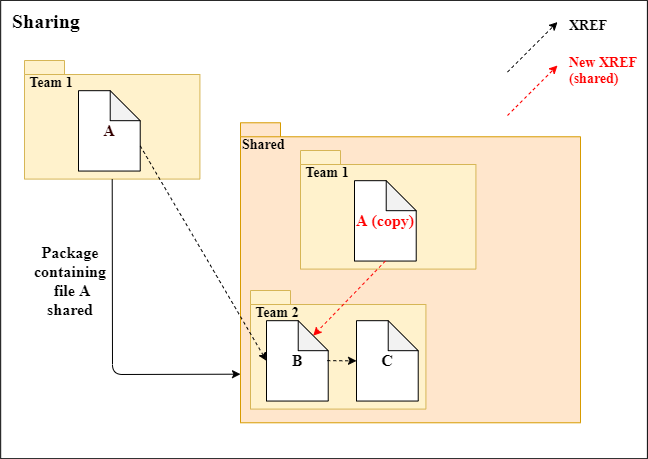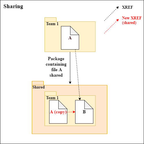 Sharing: Files A and B are copied to the Shared > Team 1 folder, and an XREF is created between the copies.
