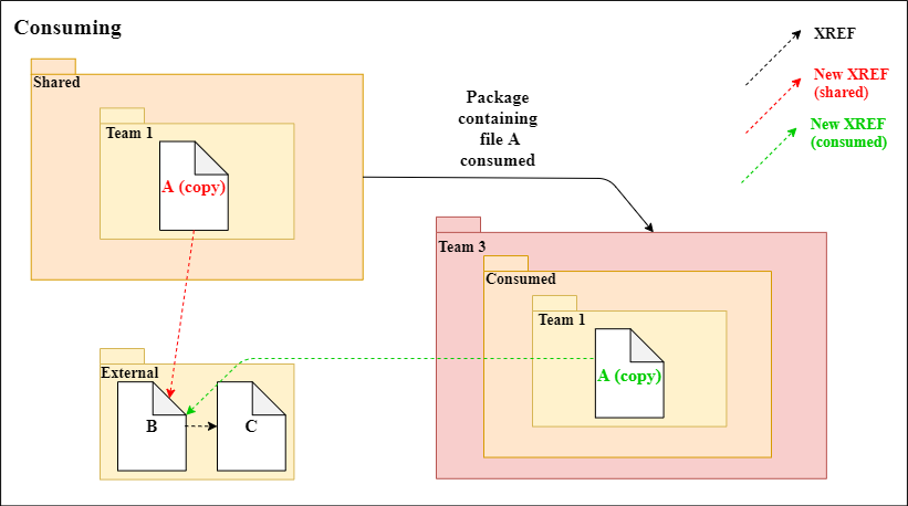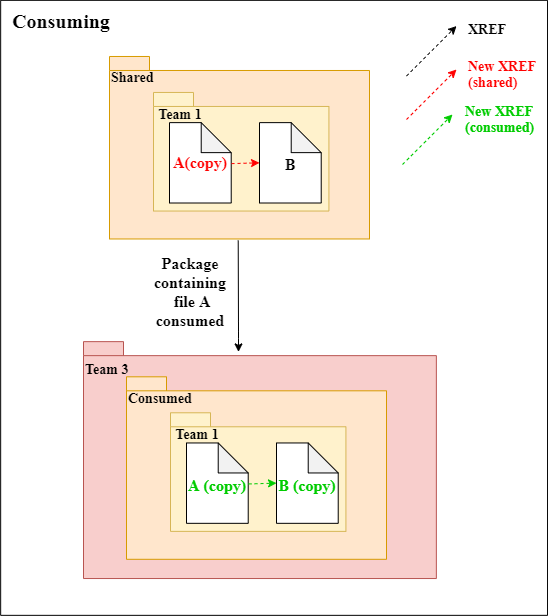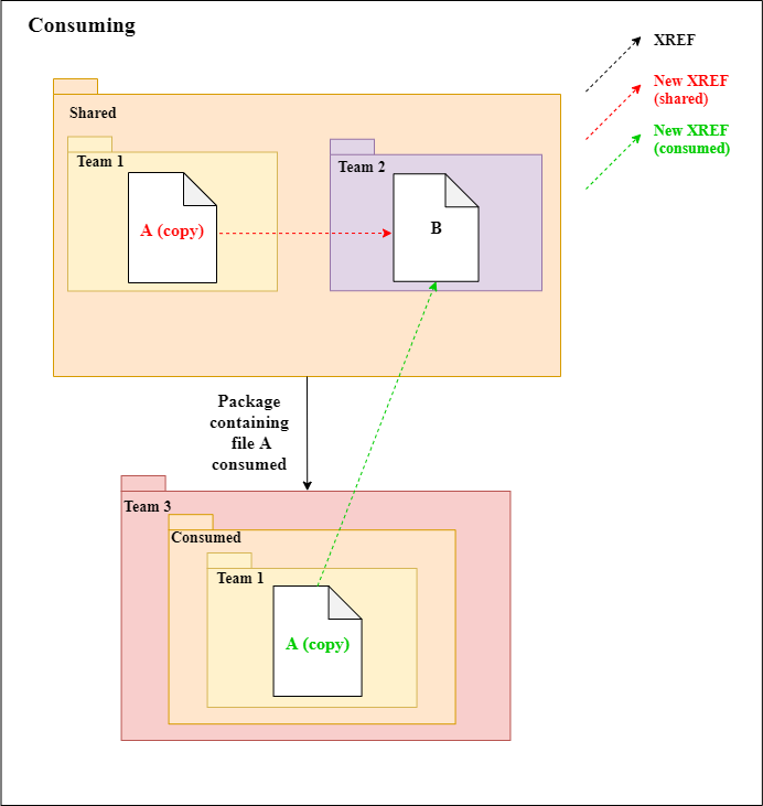 Consuming: When Team 3 consumes the package, file A is copied to the Team 3 > Consumed > Team 1 folder, and an XREF is created between the copy of file A, and the copy of file B in the Shared > Team 2 folder.