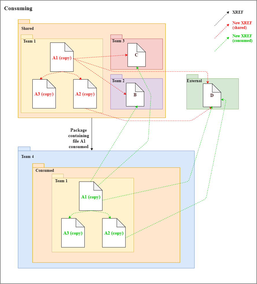 Consuming: When Team 4 consumes the package, files A1, A2, and A3 are copied to the Team 4 > Consumed > Team 1 folder. XREFs are created between the copy of file A1 and: